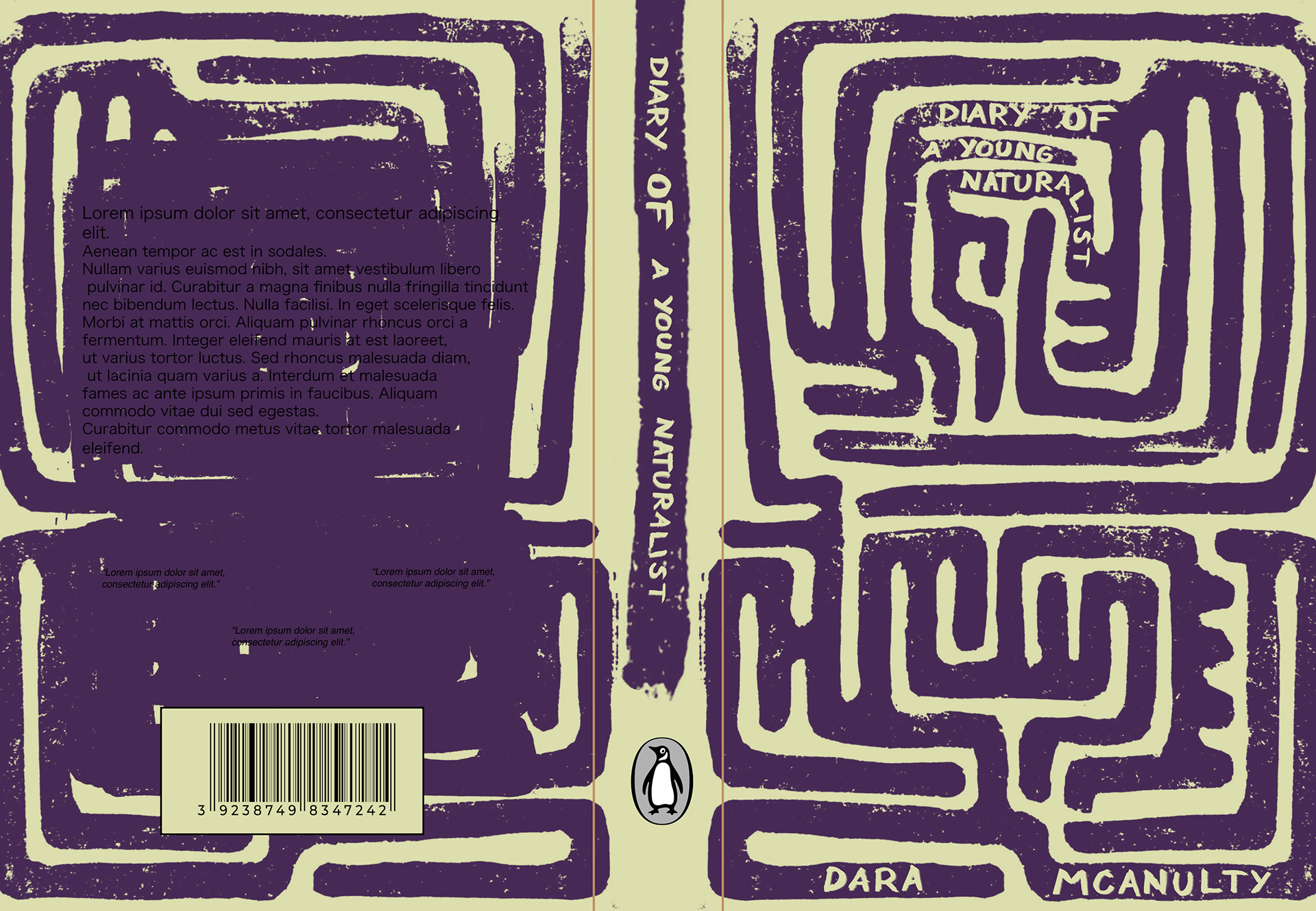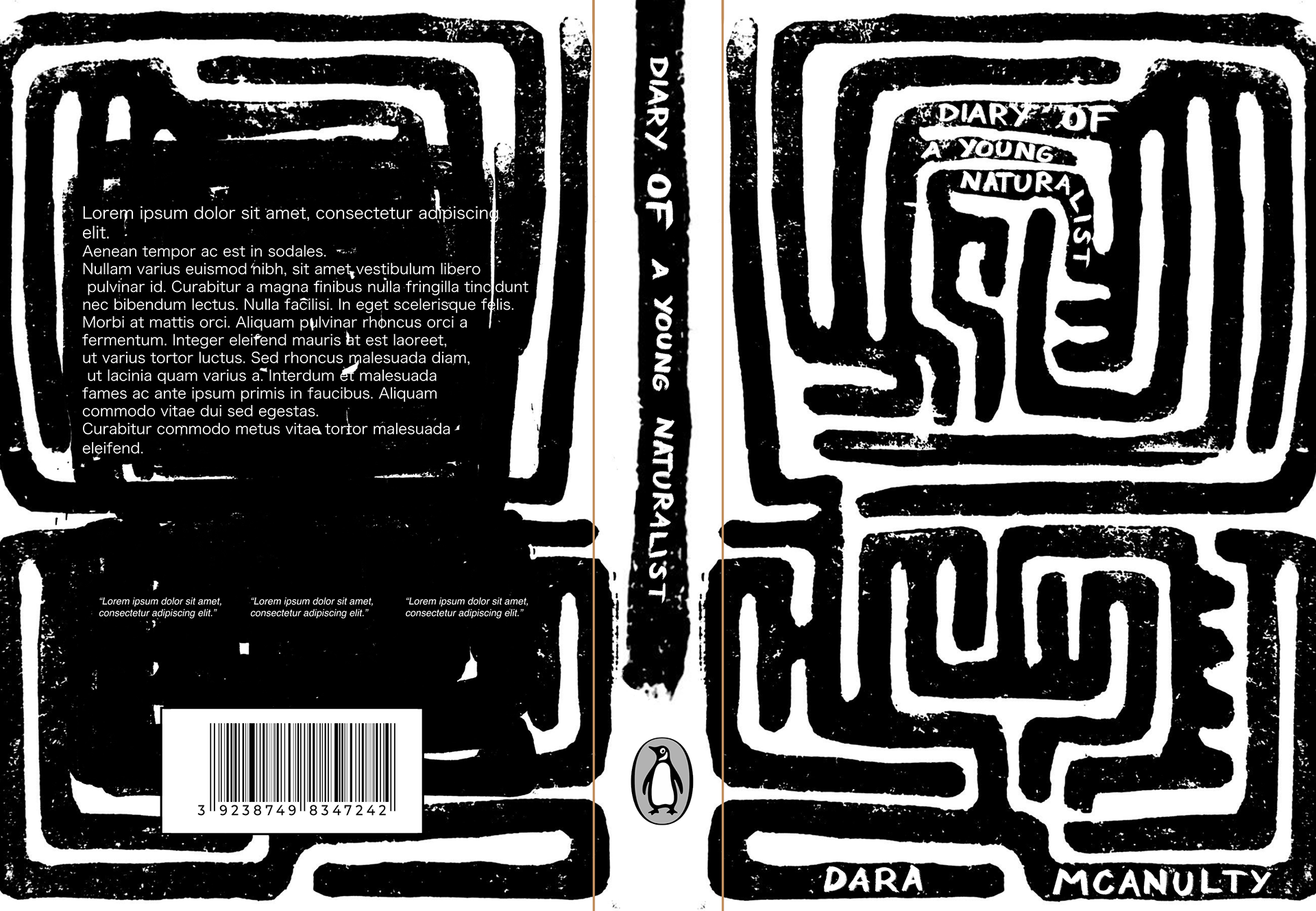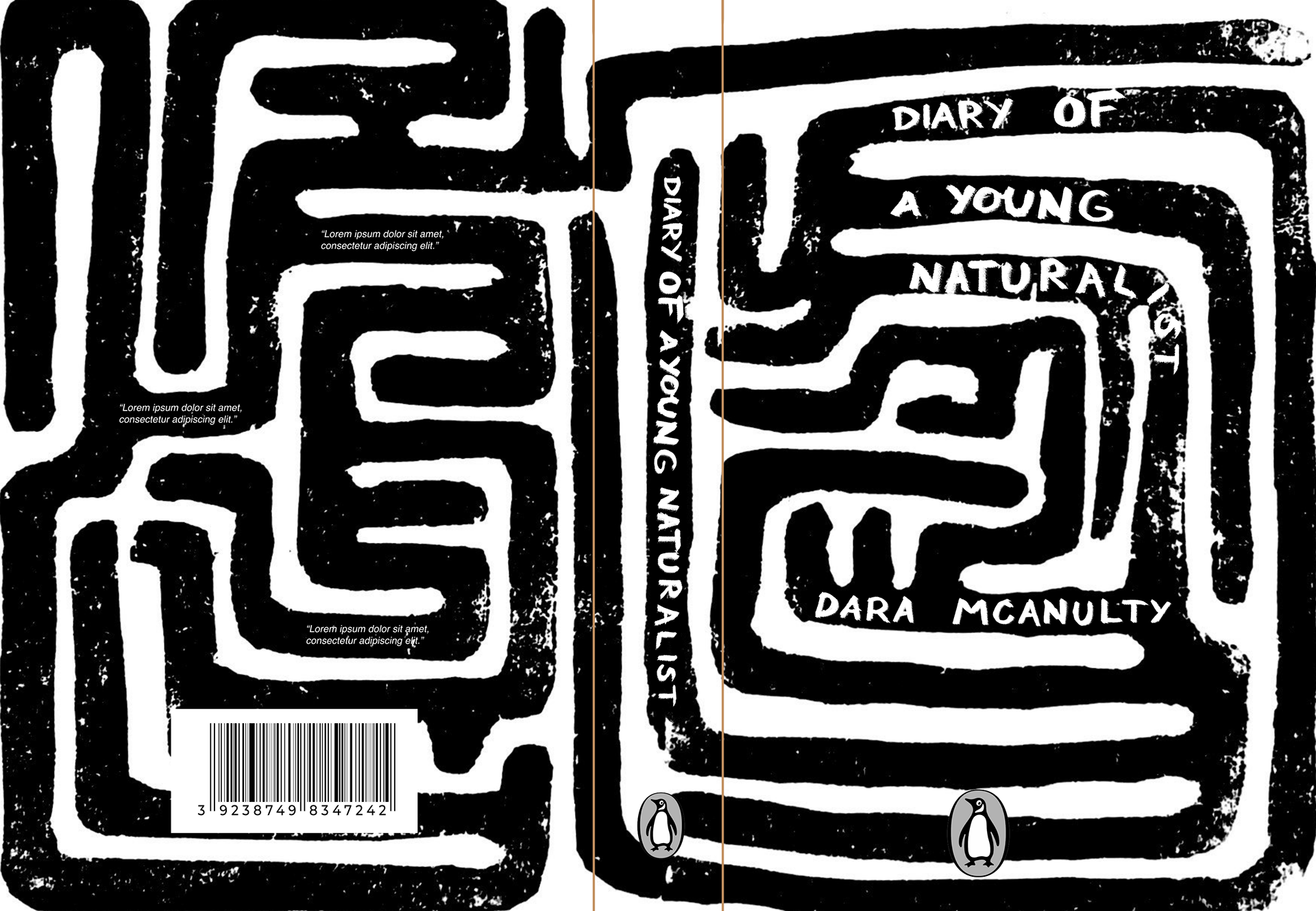 As part of a project I made a draft for 'Diary of a young naturalist' by Dara Mcanulty. The cover itself is lino print, designed with natural elements in mind. The pattern represnts loss of direction and finding your own path, like traversing a hedge maze.