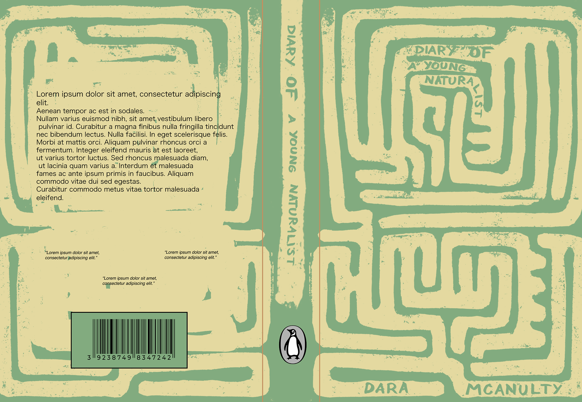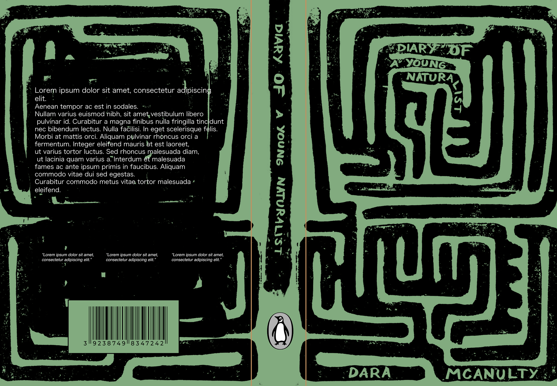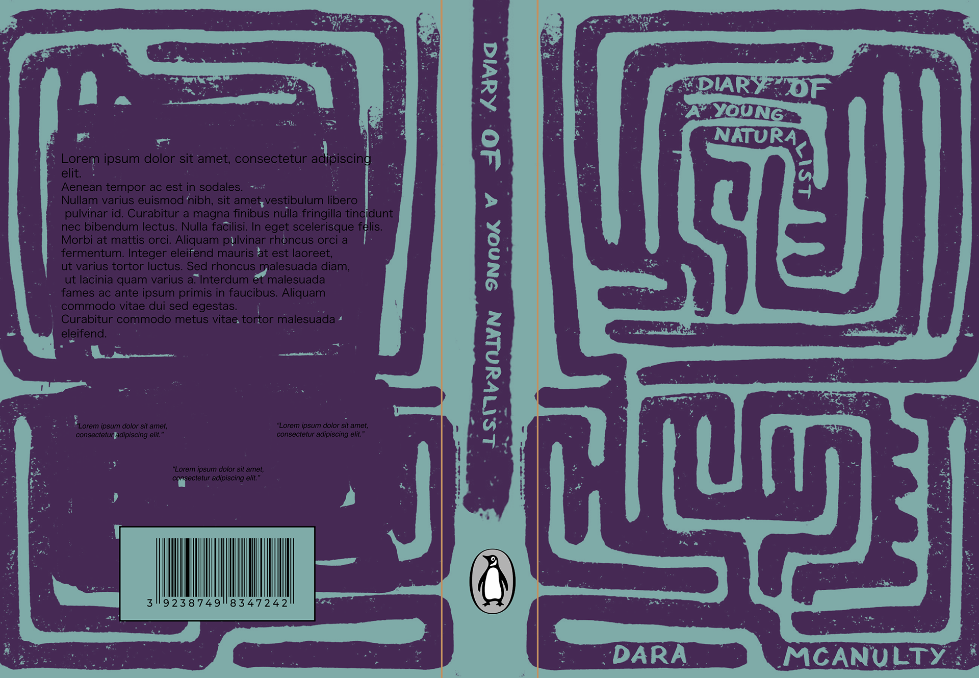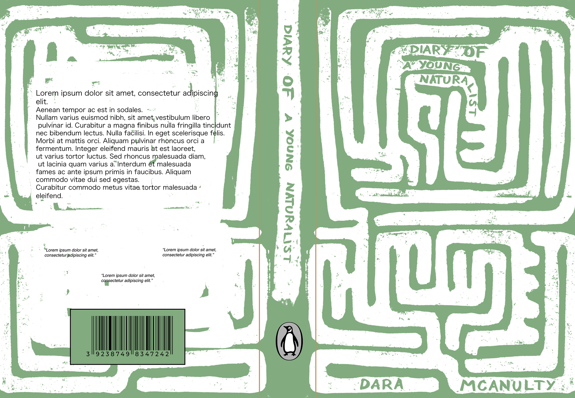 As part of a project I made a draft for 'Diary of a young naturalist' by Dara Mcanulty. The cover itself is lino print, designed with natural elements in mind. The pattern represnts loss of direction and finding your own path, like traversing a hedge maze.